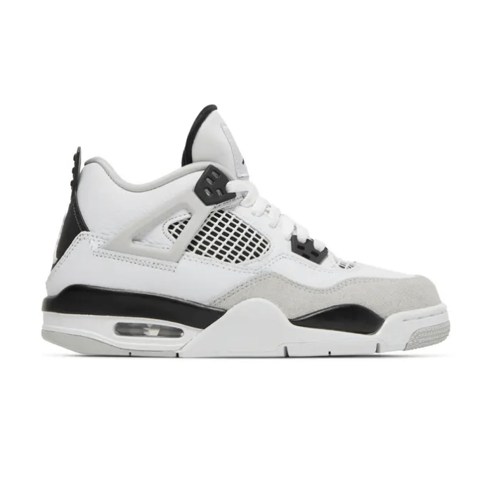 Classic meets contemporary with the Air Jordan 4 Retro Military Black, a fresh twist on an iconic silhouette. Drawing inspiration from the OG “Military Blue” colorway, this pair swaps blue for sleek black, creating a clean and versatile design. The upper features premium white leather with soft grey suede overlays, contrasted by bold black accents on the eyelets, wings, heel tab, and midsole. With signature mesh paneling, visible Air cushioning, and a supportive mid-top structure, this sneaker balances timeless Jordan heritage with everyday wearability. Whether you’re a collector or rocking them daily, the Military Black is a must-have that pairs effortlessly with any fit.