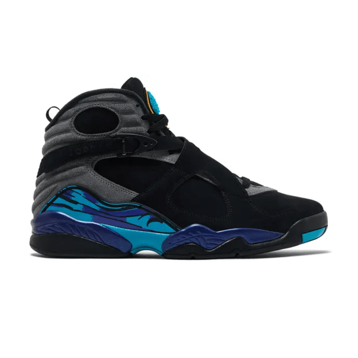 The legend returns. The Jordan 8 Retro “Aqua” (2025) brings back one of the most iconic colorways in sneaker history?bold, unapologetic, and true to its ’90s roots. Originally debuted during the 1993 All-Star Game, this 2025 edition stays true to the original with a sleek black nubuck upper, vibrant aqua and purple accents, and signature criss-cross straps for lockdown support. The chenille Jumpman tongue patch and sculpted midsole deliver both heritage style and everyday comfort. Whether you’re a longtime collector or new to the game, the Aqua 8s are a must-have piece of Jordan Brand history.
